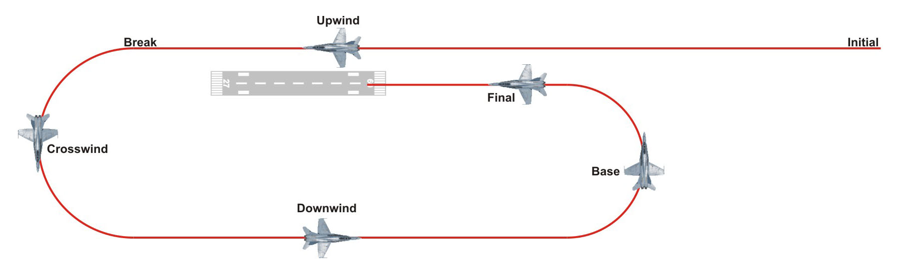Falls nicht explizit anders angeordnet wird die Platzrunde immer linksrum, also gegen den Uhrzeigersinn geflogen. Ihre Form ist an Land meist rechteckig and auf See Rennbahnförmig.