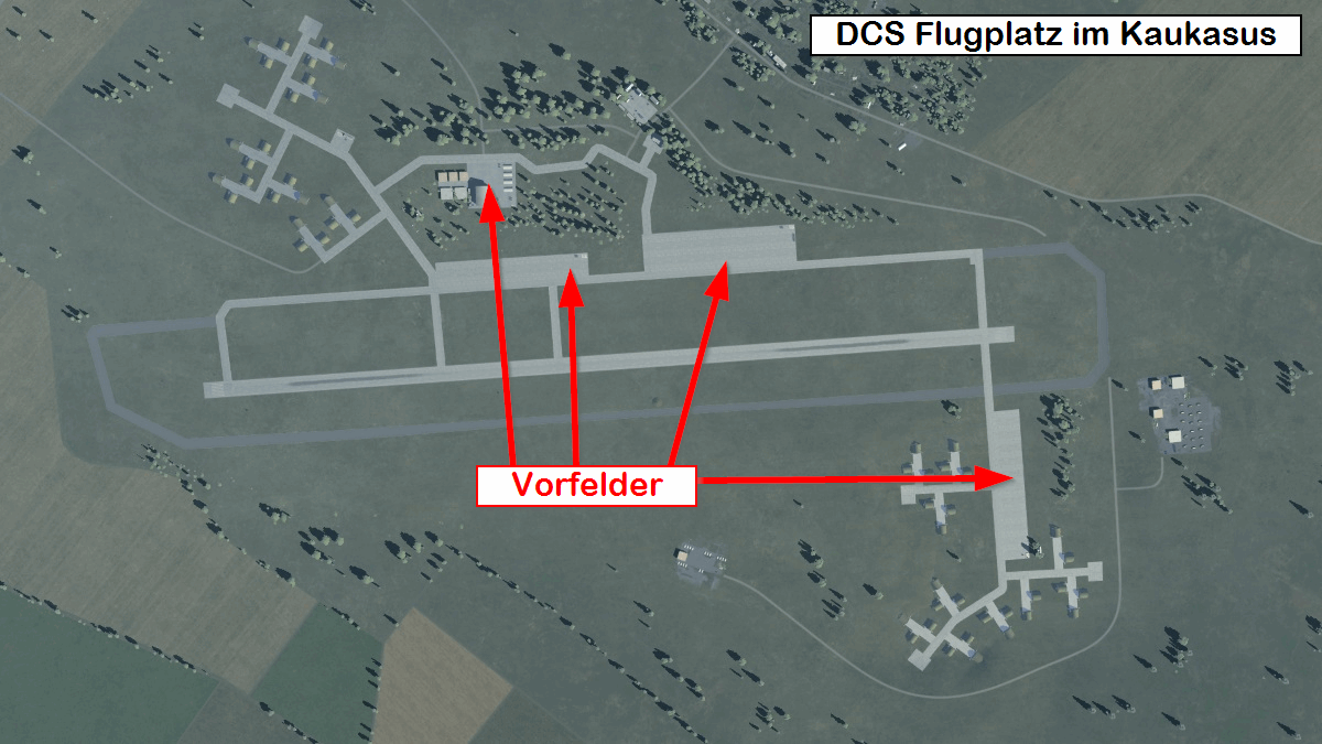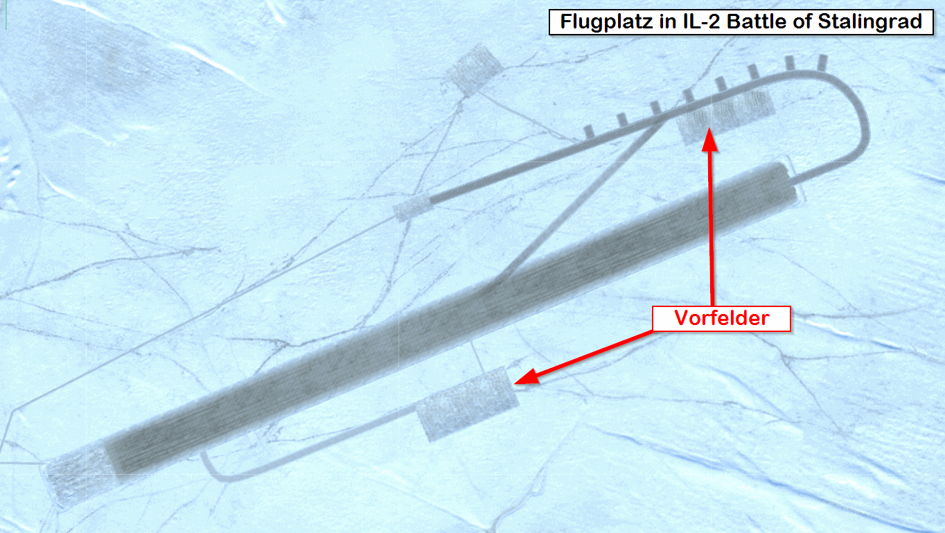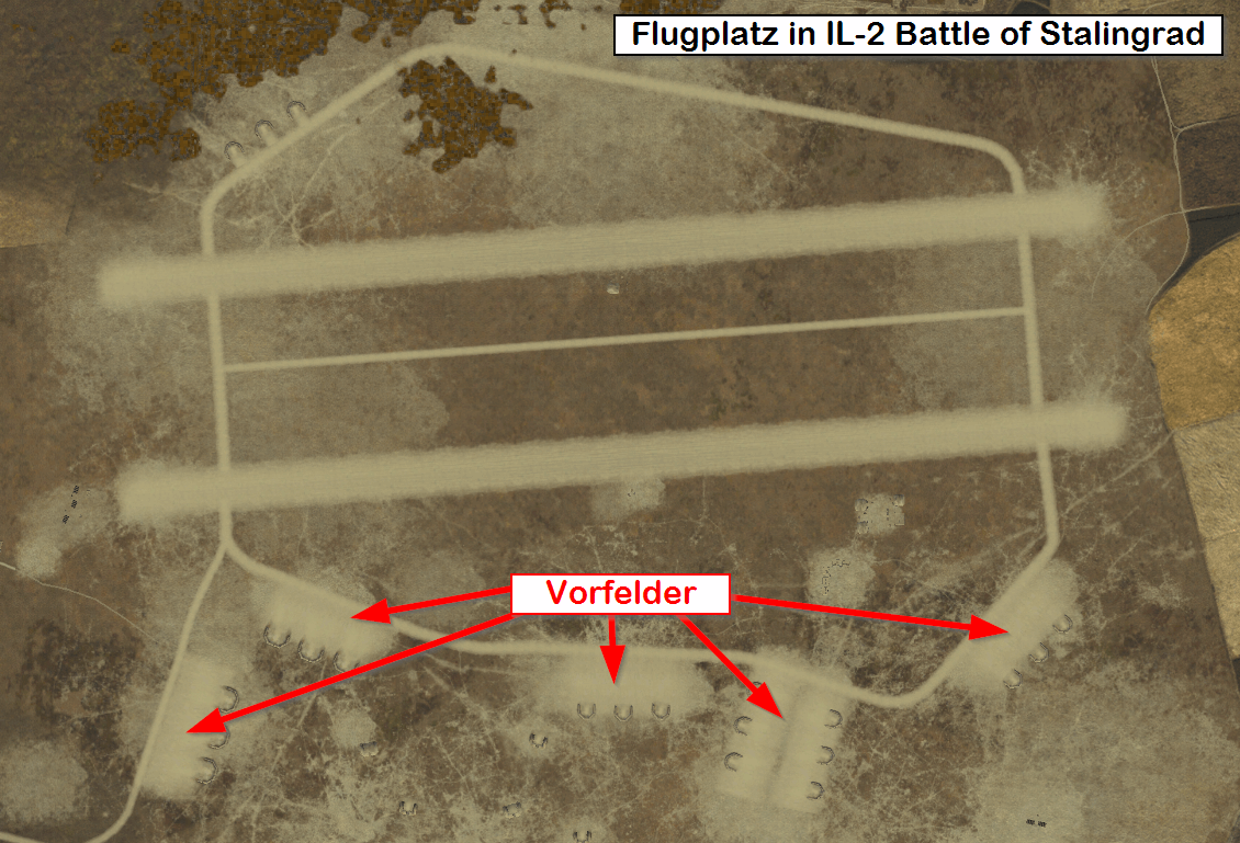 Hier Beispiele aus IL-2. Links handelt es sich um einen nicht befestigten Flugplatz mit mehreren Vorfeldern. Das Flugfeld rechts wurde mittels Betonplatten befestigt und besitzt zwei Vorfelder.