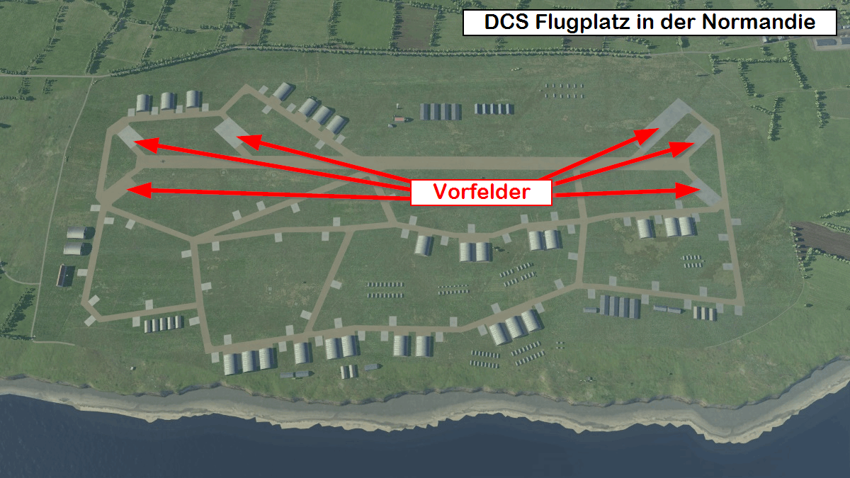 Jetzt zwei Beispiele für Flugfelder in DCS. Links aus der Kaukasus Map (Anapa Vityazevo) und rechts aus der Normandie (Saint Pierre du Mont).