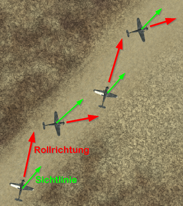 Wie man im Bild anhand der roten Pfeile erkennt, rollt man im Zickzack-Muster über den Rollweg. Dabei schaut man durch das Seitenfenster entlang der Rollbahn. Der Winkel muss so gewählt werden, dass man genügend Sicht nach vorne hat und dabei auf der Rollbahn bleibt. Wenn man sich sicher ist, wählt man einen flacheren Winkel, um schneller vorwärts zu kommen. Und wenn man kontrollieren will, wo man ist und ob der Weg frei ist, dann nimmt man wieder einen steileren Winkel.