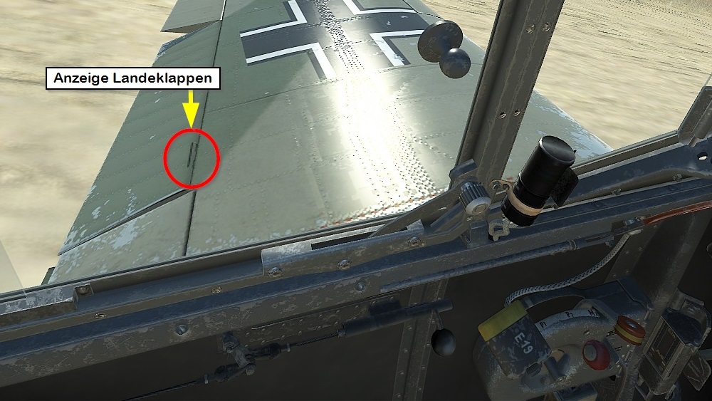 Auf dem Flügel sind Anzeigen für die Stellung der Landeklappen und der Wasserkühlung angebracht: