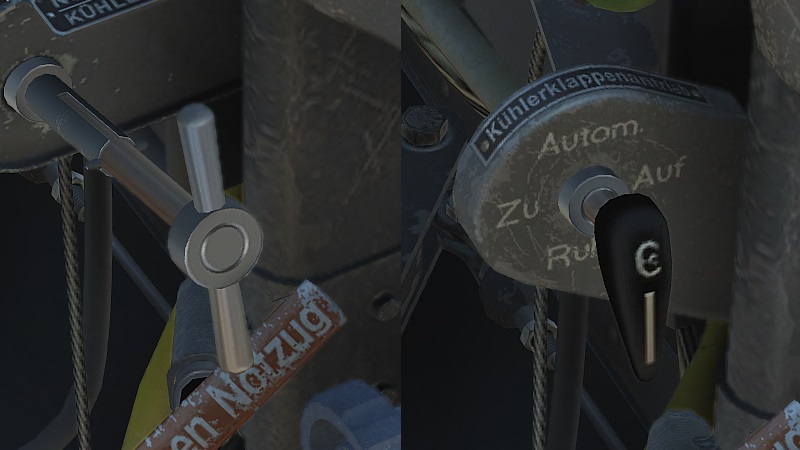Die F-2 hat einen Hebel (im Bild linke Seite), der nur zwei Positionen hat: Automatik (vertikal, wie abgebildet) oder Kühler komplett offen (horizontal).