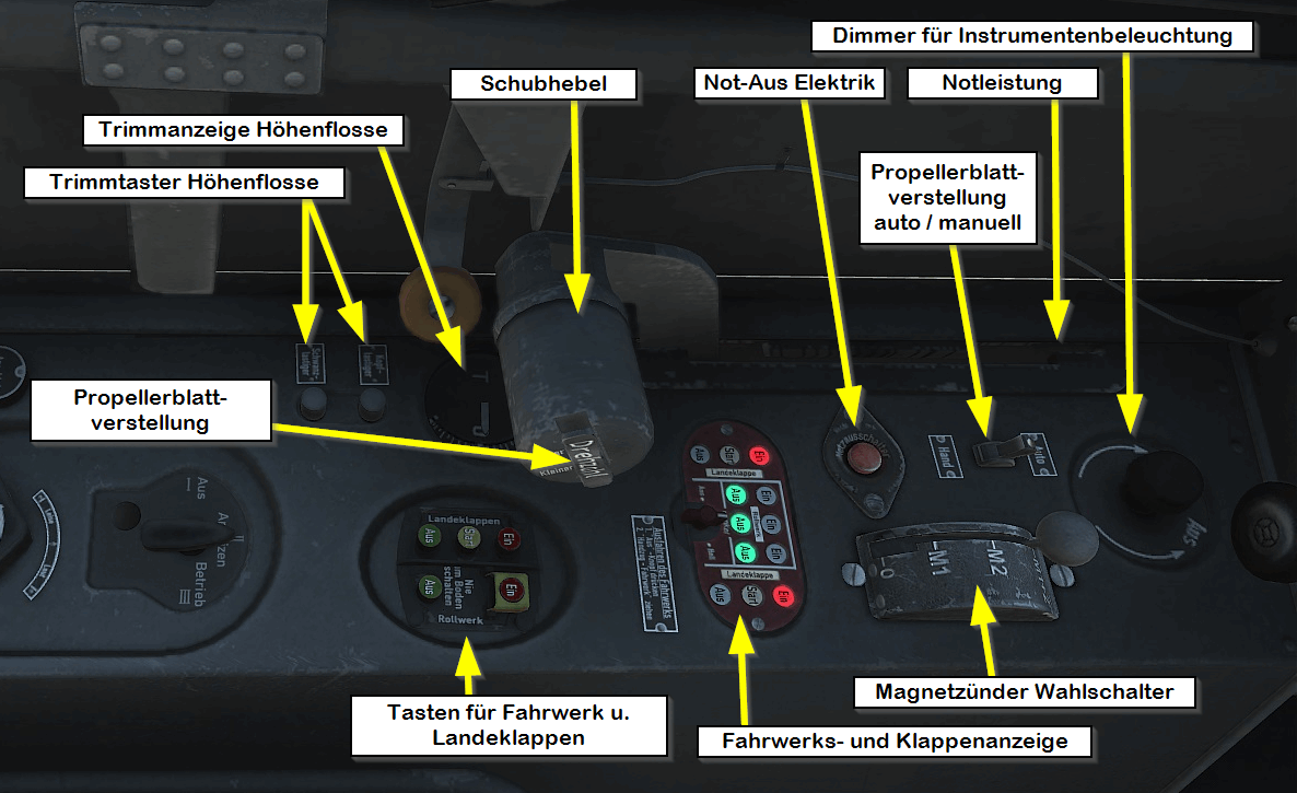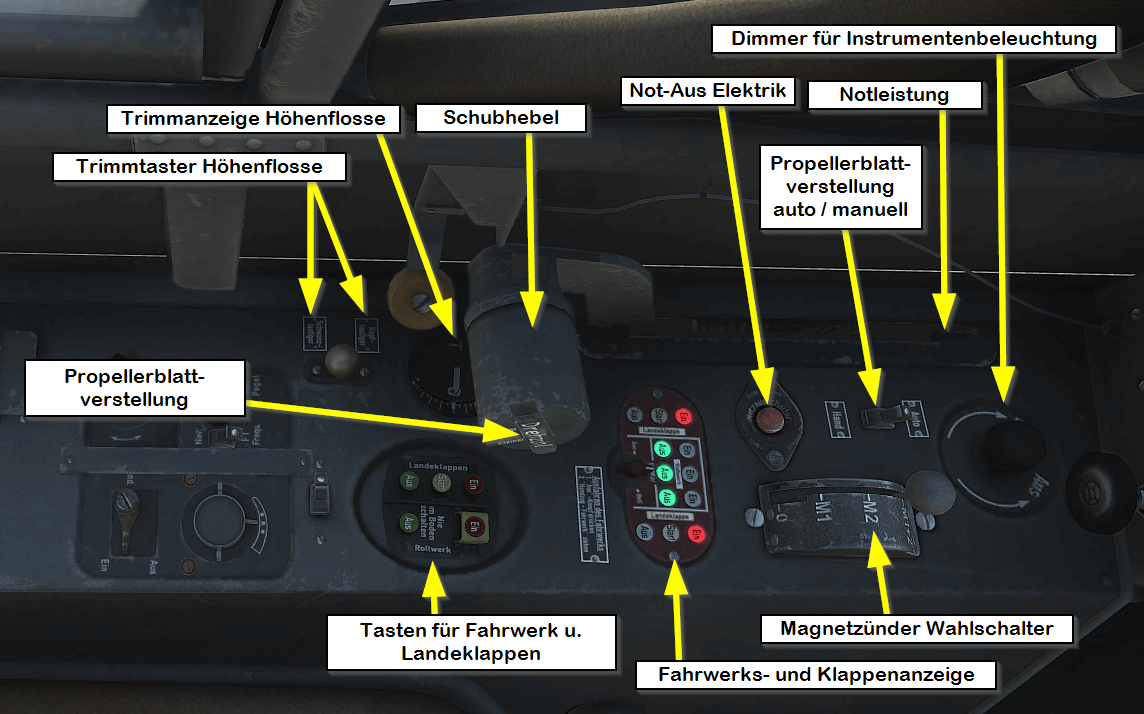 Die linke Konsole beinhaltet die Kontrollen für Schub, Trimmung, Fahrwerk, Klappen und Propellerblattverstellung: