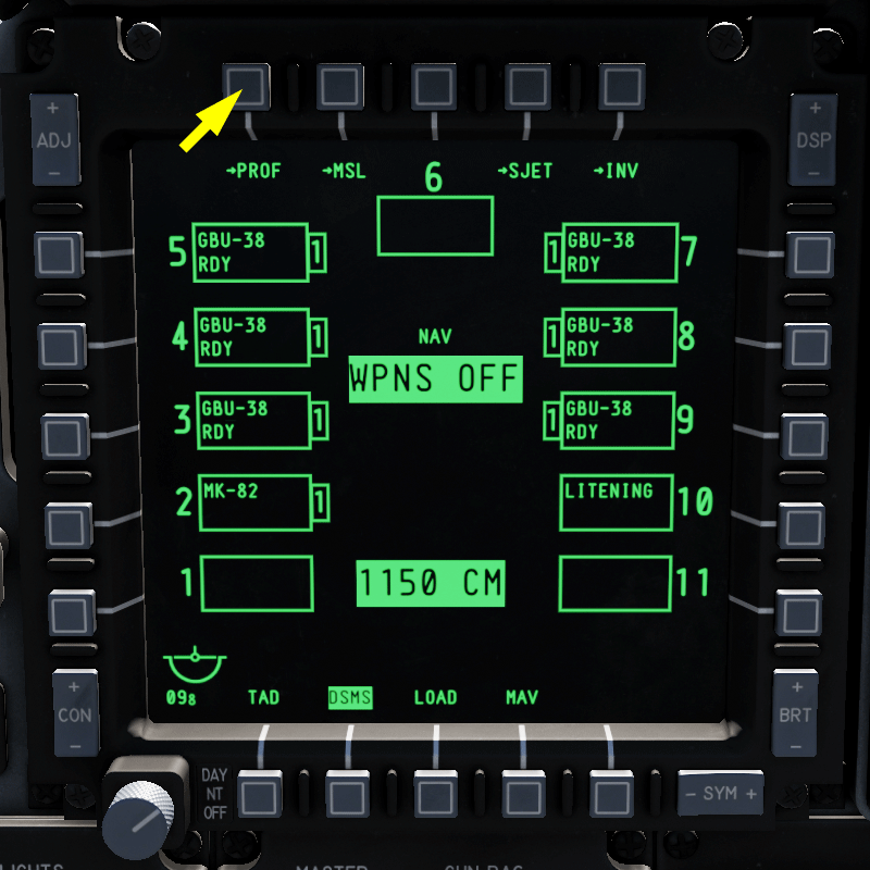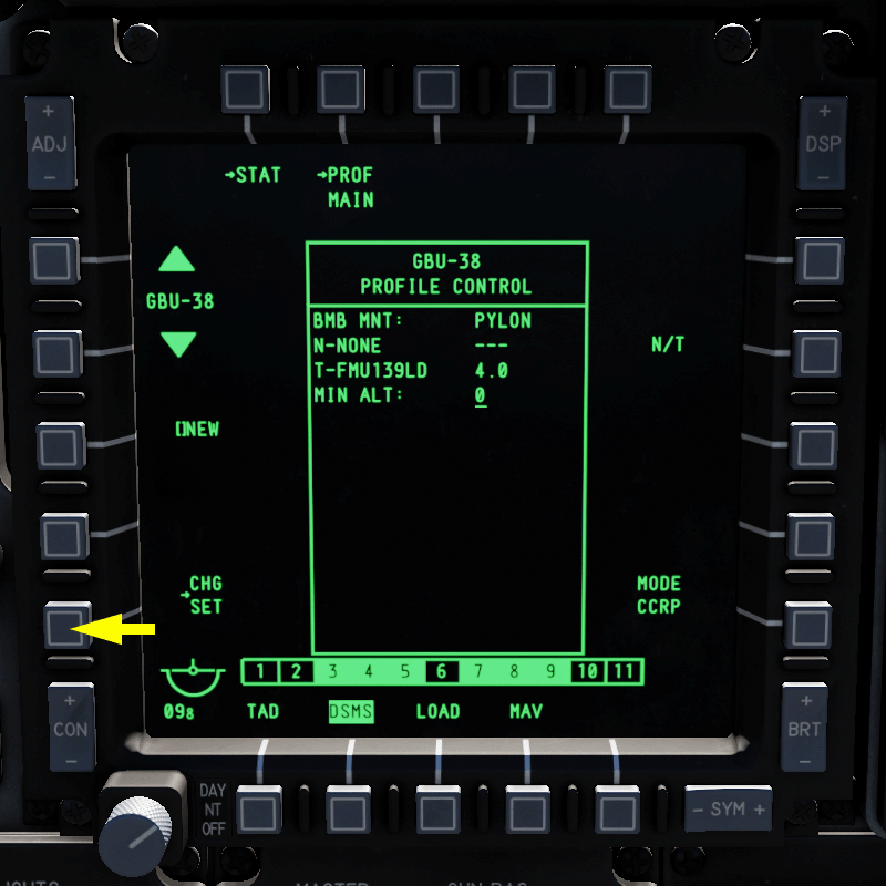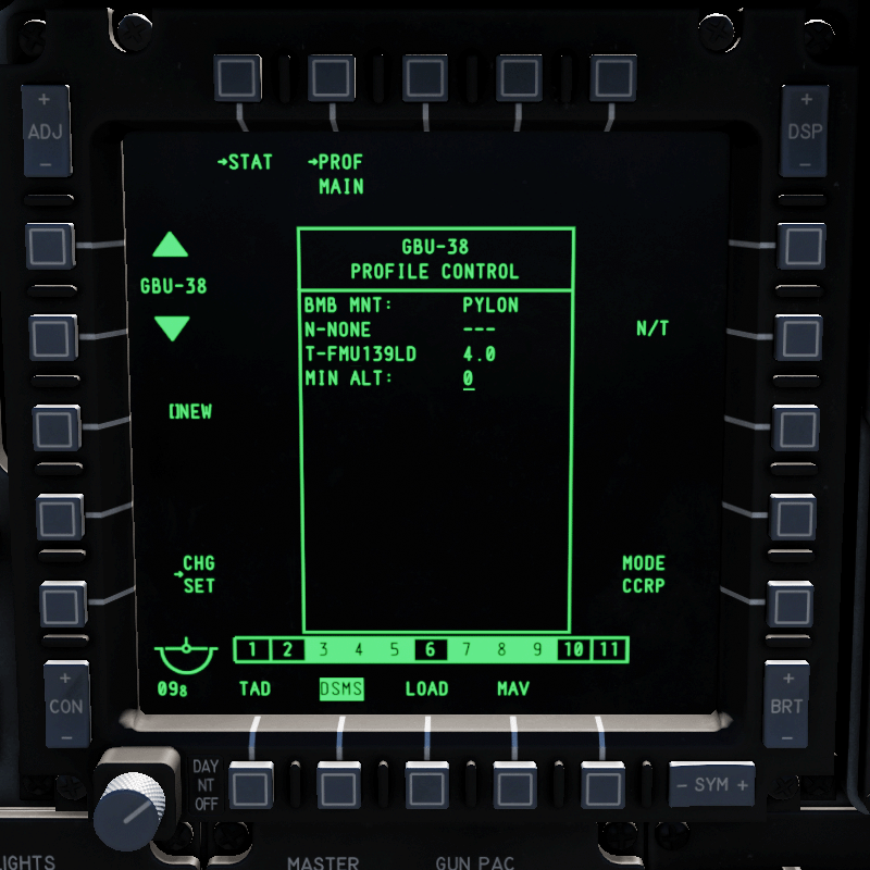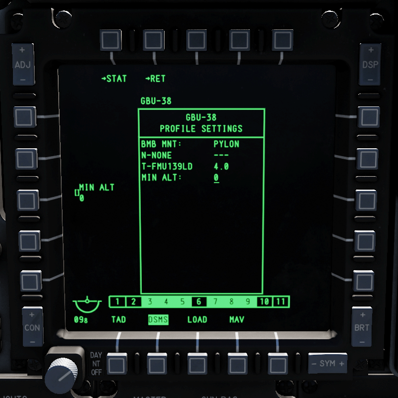 - MIN ALT (Minimum Altitude): Hiermit stellst du die minimale Abwurfhöhe ein. Bist du tiefer, dann wird das X auf dem HUD angezeigt. Auch die MRS-Markierung auf der PBIL-Linie im CCRP-Modus richtet sich nach dieser Einstellung.
