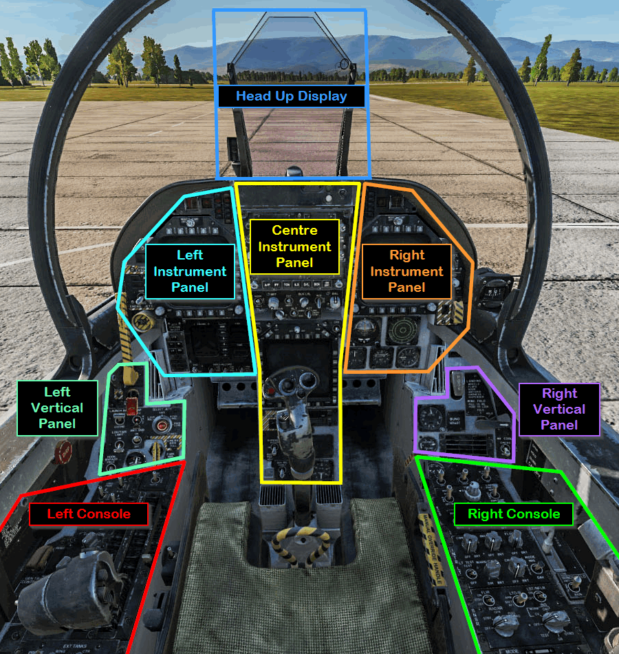 The cockpit is divided into 5 general areas. We are using the designations from the DCS F/A-18C Manual so that it can be read parallel with this course without confusion.