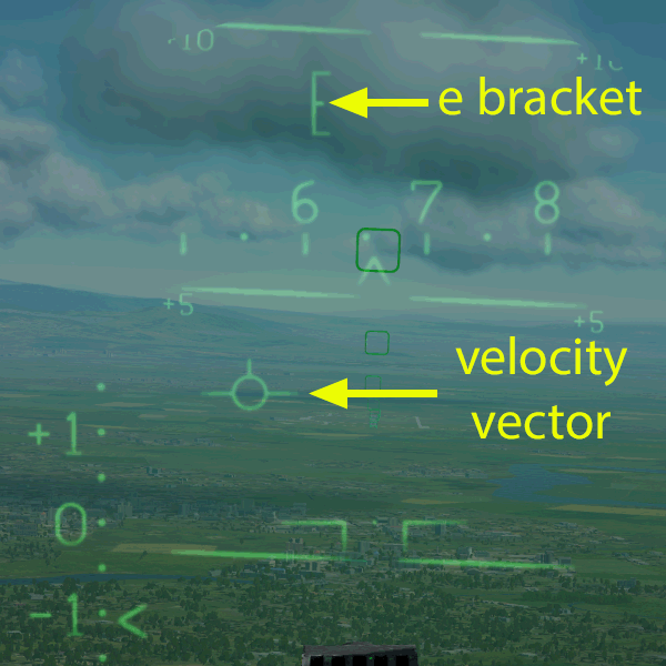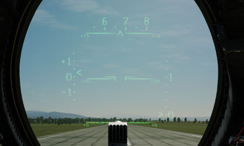 Auf dem HUD gibt es auch ein paar hilfreiche Anzeigen. Zunächste wäre da der Velocity Vector. Dieses Symbol soll dir zeigen in welche Richtung dein Flugzeug fliegt und nicht in welche Richtung die Flugzeugnase zeigt. Bei der Landung ist das durch den Anstellwinkel nicht deckungsgleich. Im Sinkflug legt man den VV auf den Anfang der Landebahn. Bei modernen Jet wie z.B. der F/A-18C und der A-10C ist das sehr hilfreich.