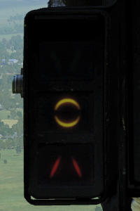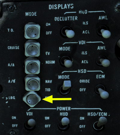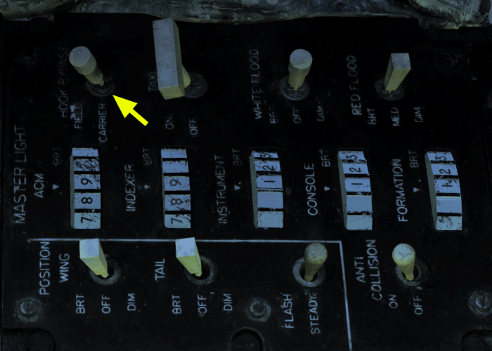 - Der AOA-Indexer blinkt, wenn der Fanghaken nicht ausgefahren ist. Da du auf Land landest, brauchst du keinen Fanghaken und musst den HOOK OVERRIDE auf FIELD setzen HOOK BYPASS FIELD.