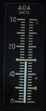 Der Approach Indexer ist gut für eine schnelle Kontrolle, aber genauer ist der Angle-of-Attack Indicator. Dies ist eine Skala die den Anstellwinkel darstellt. Bei der Landung soll der Balken an der durchgezogenen Linie (15) gehalten werden.