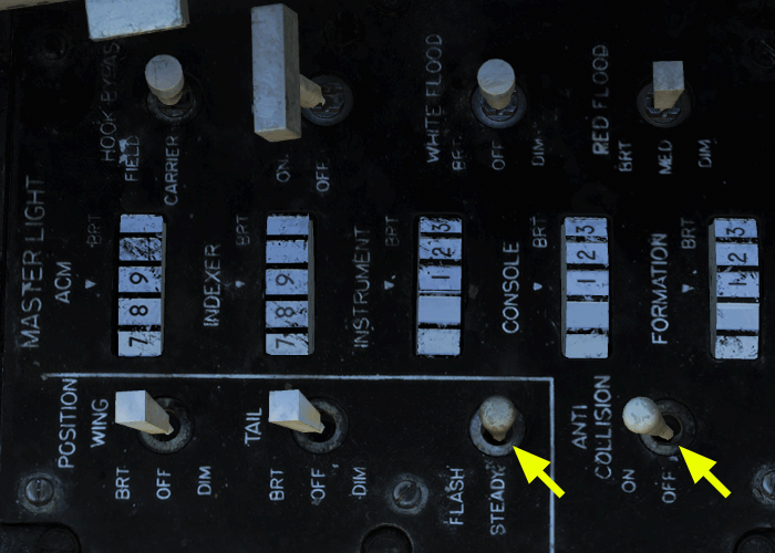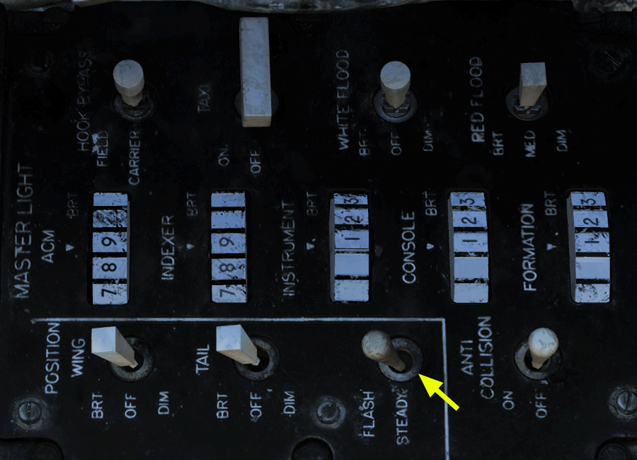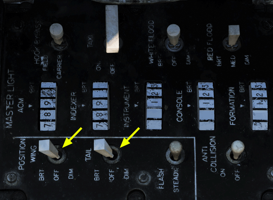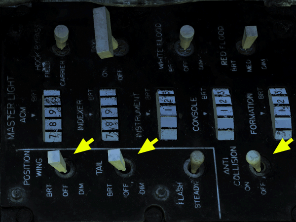 Schalte beide Positionsleuchten (WING & TAIL) an. Ob BRT oder DIM, hängt von der Situation ab. Im Zweifellsfall nimm BRT.