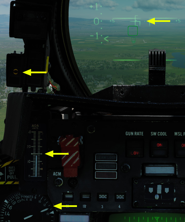 Wie du im Bild unten sehen kannst, ist die E-Bracket fast in der Mitte. Die Geschwindigkeit liegt bei ca. 135 Knoten, die 15 AOA Units sind fast erreicht und der gelbe Donut leuchtet.
