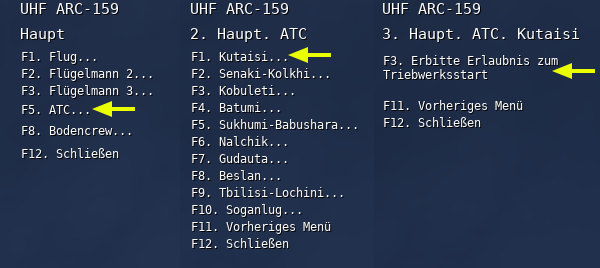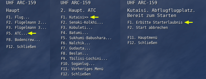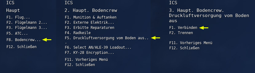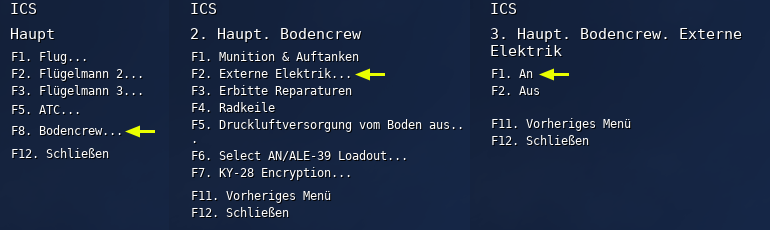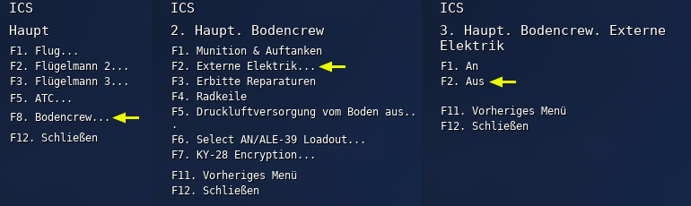 Dann F5, F1 und F3. Dann F11 und F12, um ins Hauptmenü zurückzukehren und das Funkmenü zu schließen.