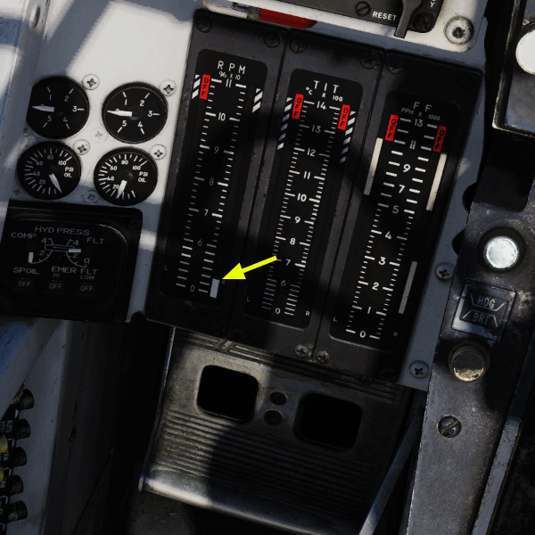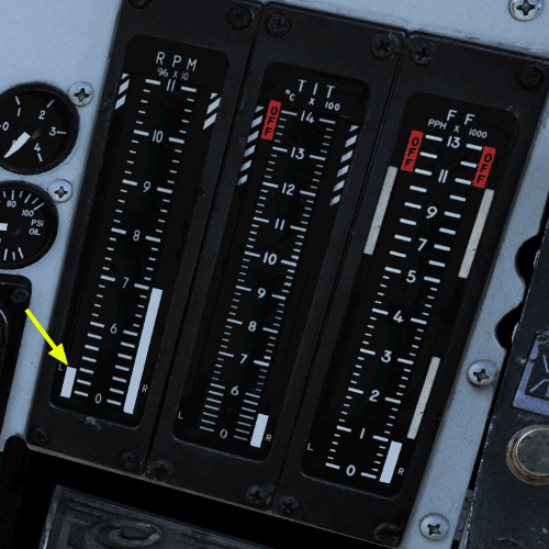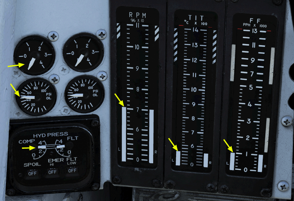 Umdrehungen pro Minute (siehe RPM) 62 - 78 % Abgastemperatur EGT (siehe TIT) 500 °C Kraftstoffdurchfluss (siehe FF) 950 - 1.400 Pph Position der Düsen 5 = 100% offen Öldruck (Siehe PSI OIL) 25 - 35 psi Hydraulikdruck (Siehe HYD PRESS FLT) 3.000 psi
