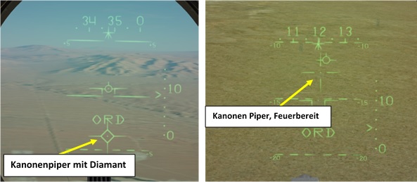 Bodenziele werden visuell ausfindig gemacht und mittels HUD-Symbolik manuell angegriffen.