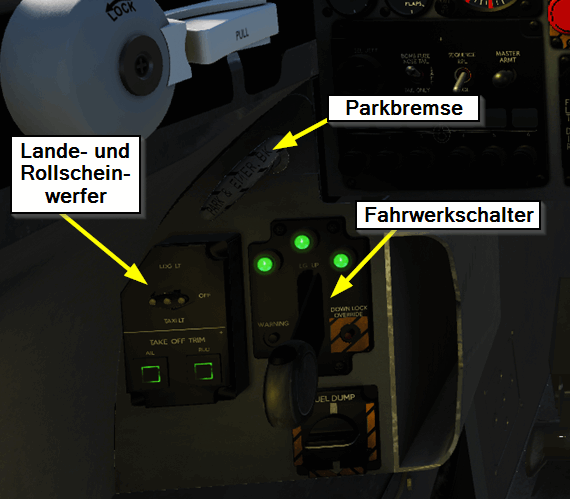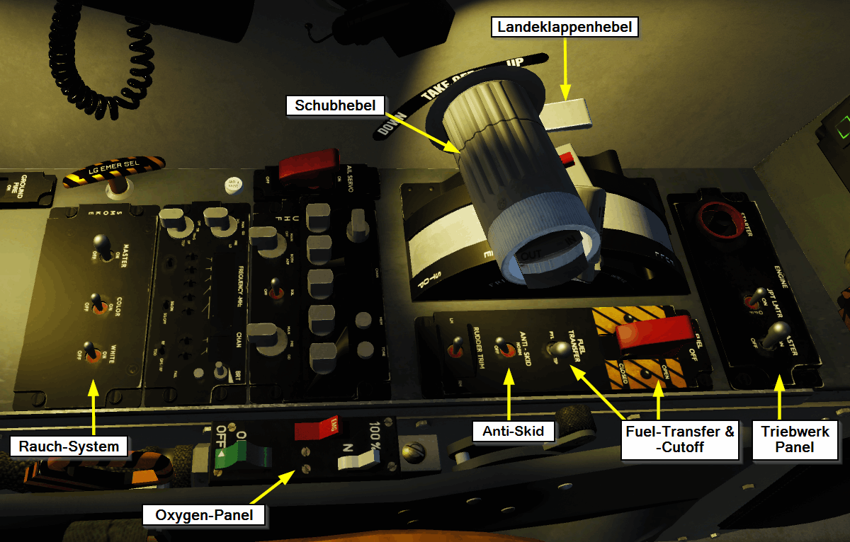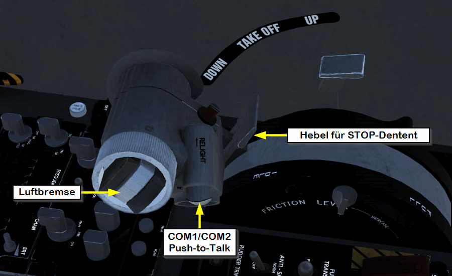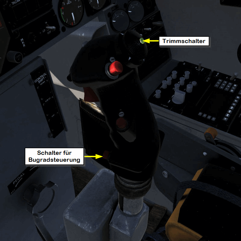 Mit dem Steuerknüppel (Abk. J) wird das Höhen- und Querruder kontrolliert. Mit dem Schubhebel (Abk. S) wird der Schub des Triebwerks kontrolliert. Wird der Schubhebel durch die Fingerraste gelöst und nach vorne geschoben, so werden die Triebwerke gezündet.