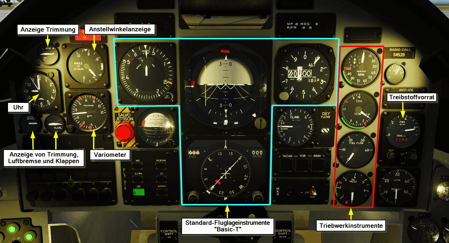 Direkt vor dem Piloten befindet sich die Haupt-Instrumentenkonsole IK. Sie wird von den Standard-Fluglageinstrumenten, dem sog. Basic-T dominiert. Hierzu zählen der künstliche Horizont, links davon der Fahrtmesser, rechts der barometrische Höhenmesser sowie unterhalb des künstlichen Horizonts der Kurskreisel.