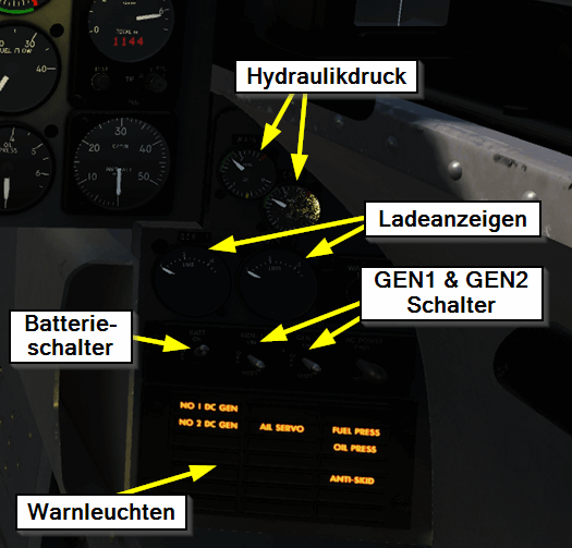 Auf der rechten Seite der Instrumentenkonsole finden sich die Triebwerküberwachungsinstrumente, sowie die Treibstoffvorratsanzeige.