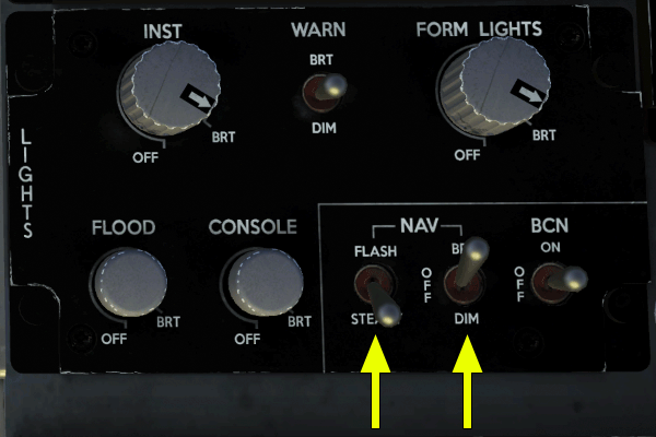 Sobald Strom auf der Maschine ist, sollten die Navigationslichter eingeschaltet werden, damit der Zustand des Flugzeuges auch von außen für das Bodenpersonal erkennbar ist.