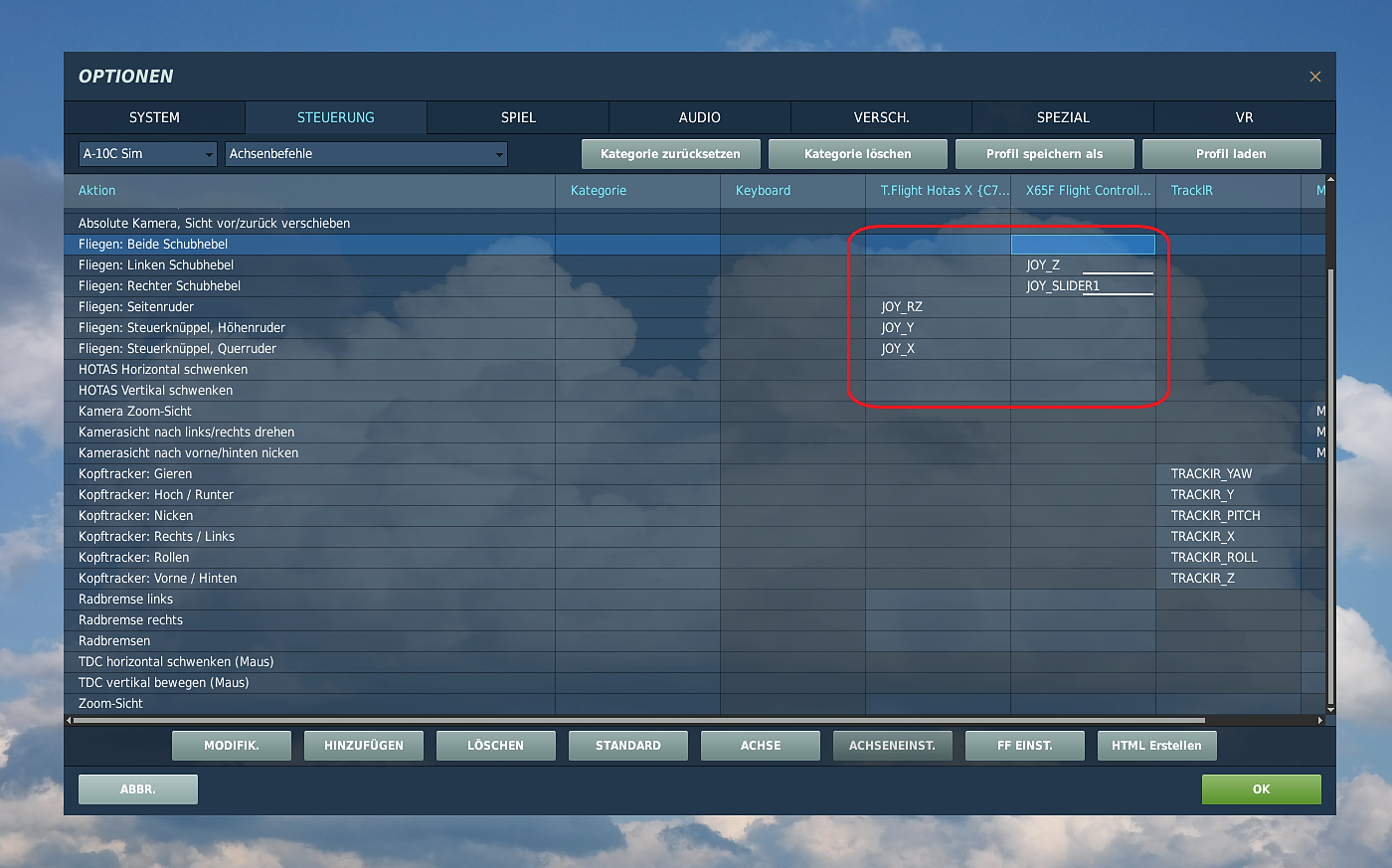 Zunächst solltest du die Rubrik Achsenbefehle auswählen oder den Button ACHSE (unten, in der Mitte) drücken. Beides wechselt in die Liste der Aktionen, die du auf eine analoge Achse (Joystick oder Schubhebel) legen kannst. Jedes Gerät wird als eigne Spalte angezeigt, während die Aktionen als Zeile zu sehen sind (siehe Markierung unten). Die aufgelisteten Eingabegeräte heißen bei dir natürlich anders.