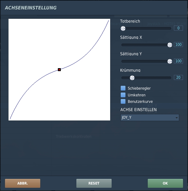 Um die Empfindlichkeit der belegten Joystickachsen einzustellen, öffnest du über den Button ACHSENEINST. den Dialog ACHSENEINSTELLUNG: