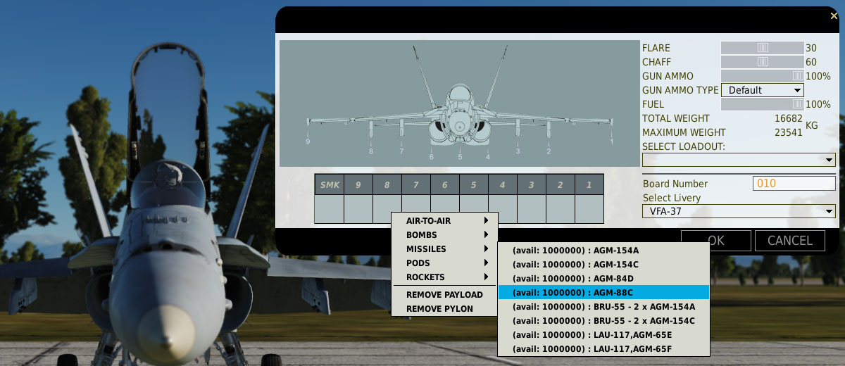 To do this, open MISSION > F/A-18C > Weapon qualification - AGM-88C HARM.