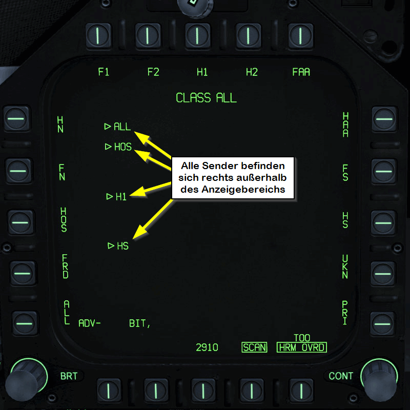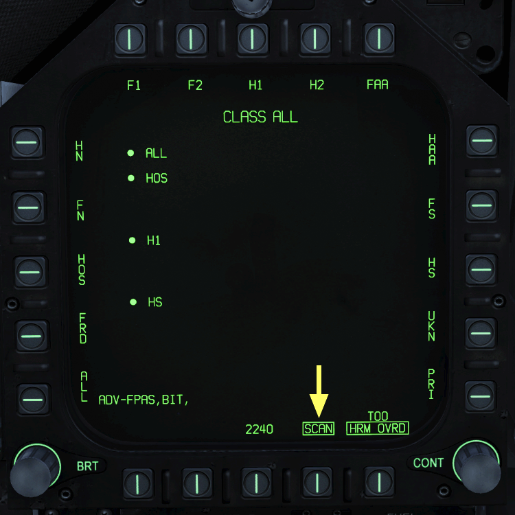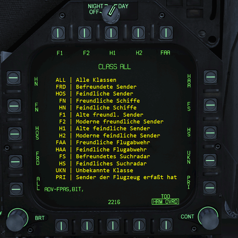 Abbreviation Description ALL All classes FRD Friendly Emitters HOS Hostile Emitters FN Friendly Ships HN Hostile Ships F1 Old Friendly Emitters F2 Modern Friendly Emitters H1 Old Hostile Emitters H2 Modern Hostile Emitters FAA Friendly Air Defence HAA Hostile Air Defence FS Friendly Search Radar HS Hostile Search Radar UKN Unknown Class PRI Emitter that has registered our aircraft - With the PB SCAN you can display a list of detected threats.