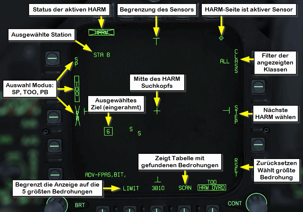 - You can change the mode on the left side of the screen. RSET resets the selection of the target. This means that the most dangerous target will be selected automatically. Select STEP you switch to the next missile.