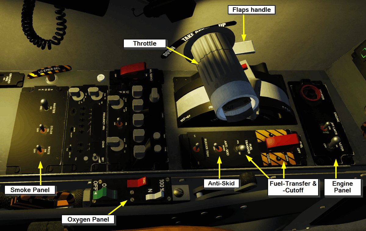 The Left Side Console LSC is dominated by the Throttle Lever. Directly outboard is the Flap Selector. On the left side of the cockpit are the: