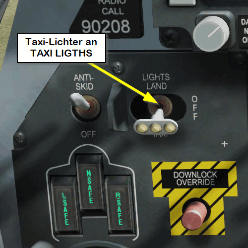 • Freigabe zum Rollen zur Startbahn beim ATC beantragen. Drücke fafür F5, F1, F1 REQUEST STARTUP HOTAS-S.