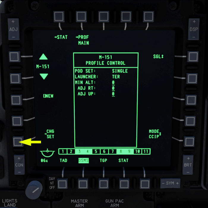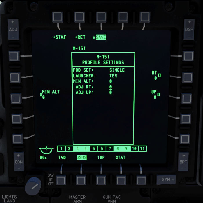 - MIN ALT (Minimum Altitude): Hiermit stellst du die minimale Abwurfhöhe ein. Bist du tiefer, dann wird das X auf dem HUD angezeigt. Auch die MRS-Markierung auf der PBIL-Linie im CCRP-Modus richtet sich nach dieser Einstellung.