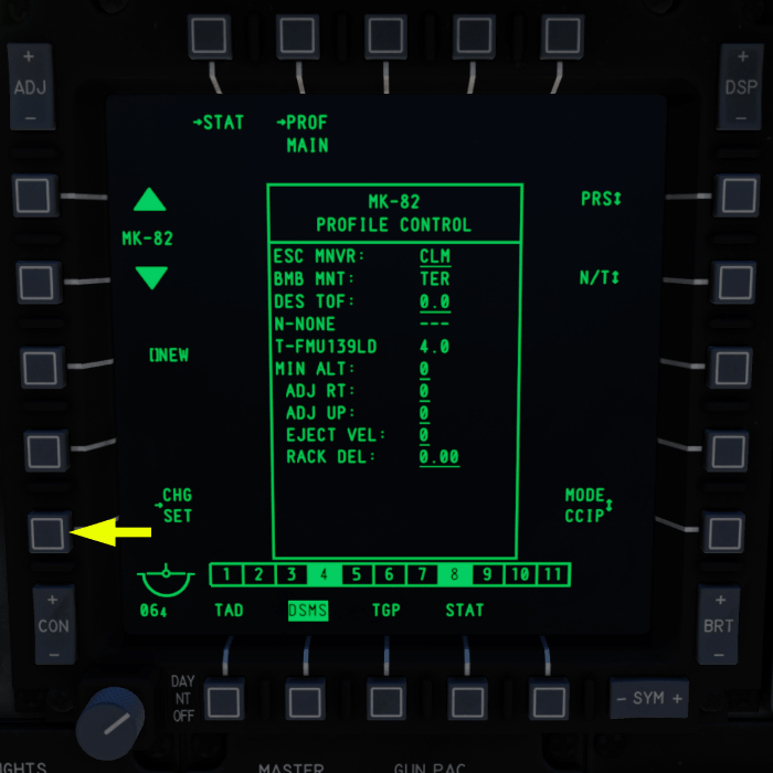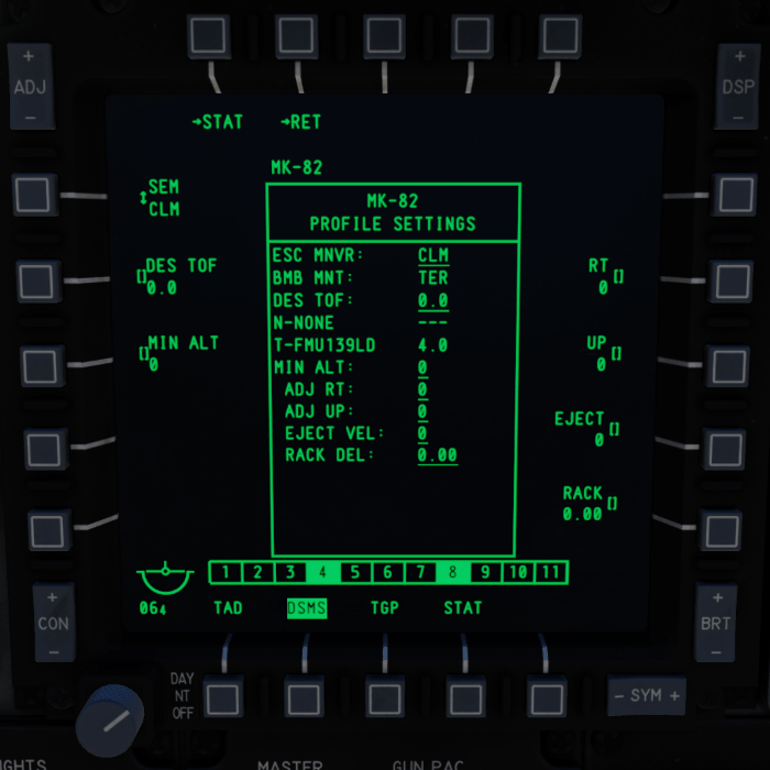 - ESC MNVR: Hiermit stellst du die Art ein, wie du dich nach dem Abwurf vom Gefahrenbereich entfernen willst (Escape Maneuver). Dies bezieht er in die Berechnung der Mindestabwurfhöhe mit ein.