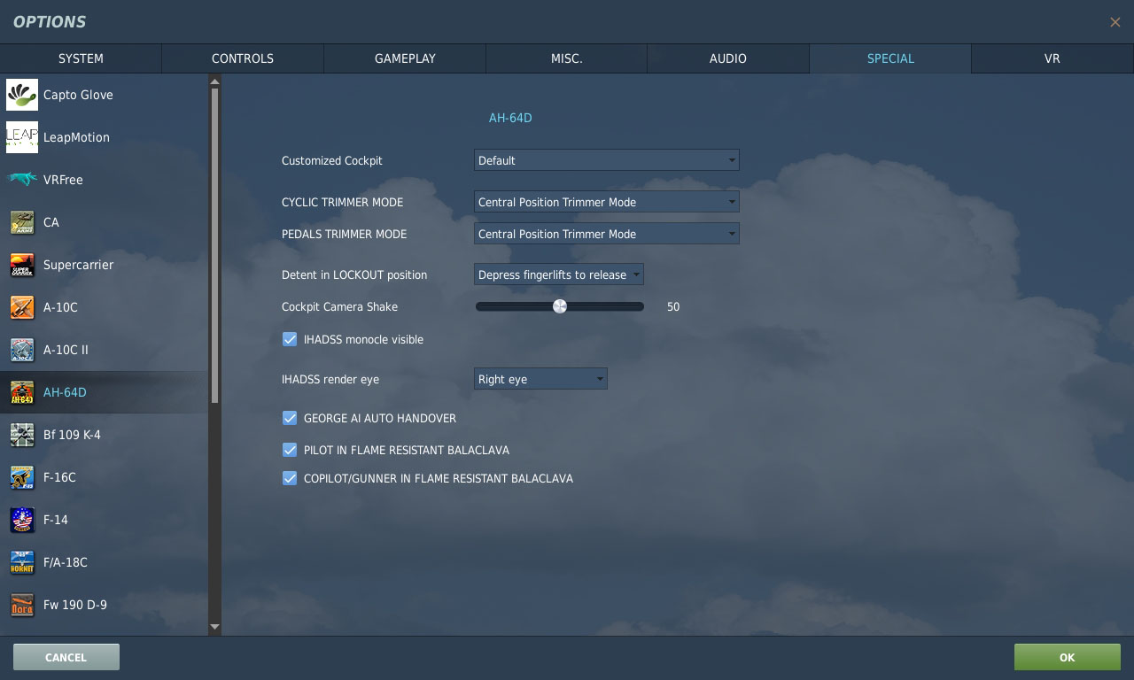 Select AH-64D on the left-hand side. Here you can select various settings.