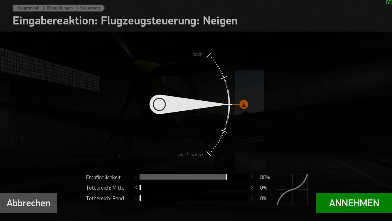 Ganz rechts wird nach der Zuweisung ein Symbol mit einer geschwungenen Linie angezeigt (Eingabereaktion). Dort kann man die Empfindlichkeit und die Totbereiche (in denen keine Funktion ausgelöst wird) der Achsen verändern. Wie man die Einstellungen wählt, hängt von vielen Faktoren ab, z. B. Qualität der Hardware, dem eigenen Können, dem persönlichen Geschmack oder den Vorlieben bei der Wahl des Flugzeugs. Daher kann man keine allgemeingültigen Aussagen zu den optimalen Einstellungen geben.