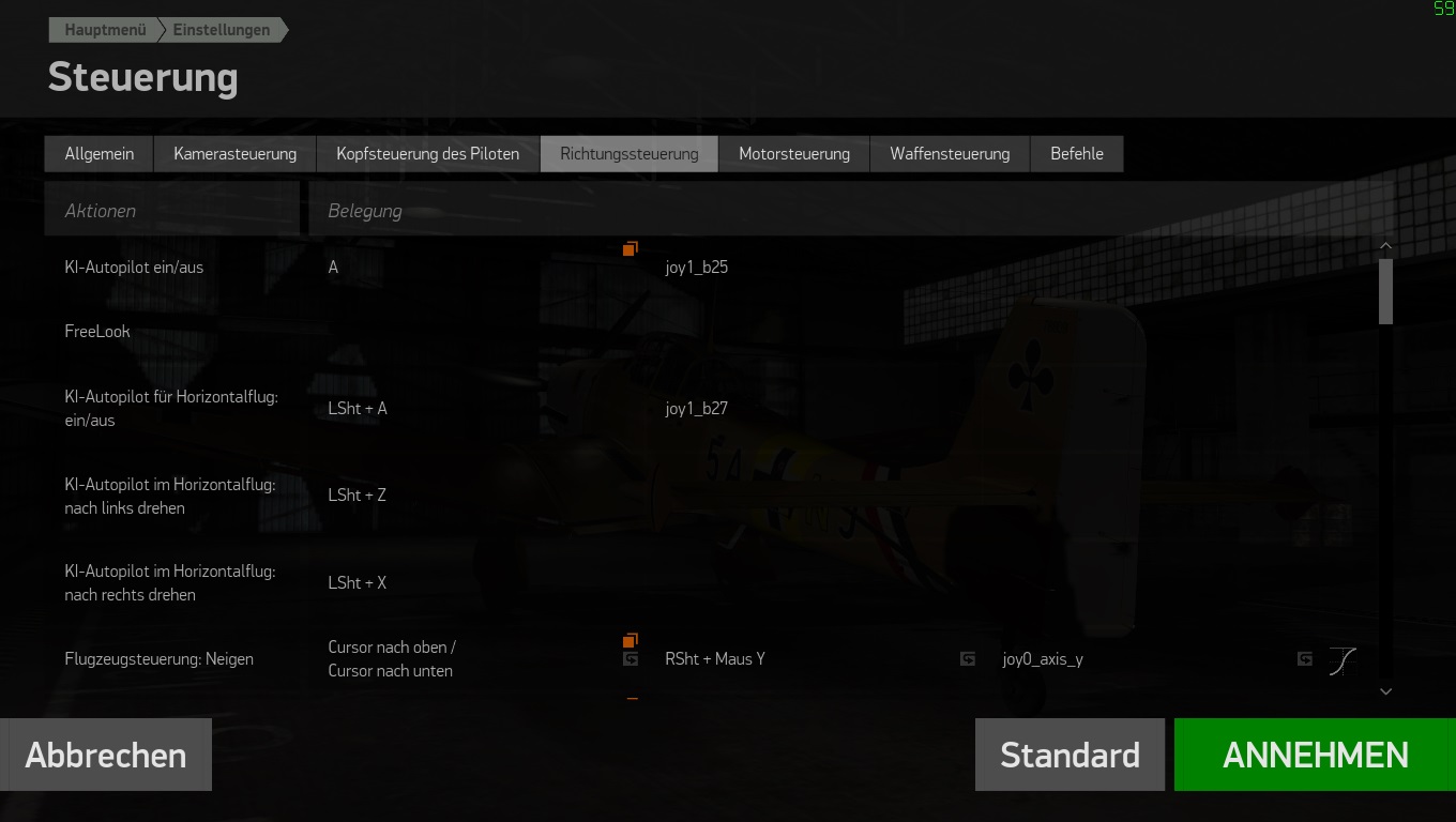 Wir können hier nicht auf jede Aktion und ihre Bedeutung eingehen. Aber wir beschreiben, wie man die Einstellungen ändert und welche Funktionen für den Anfang benötigt werden. In den Basiskursen für die einzelnen Flugzeuge werden wir speziell benötigte Belegungen für das entsprechende Flugzeug beschreiben.