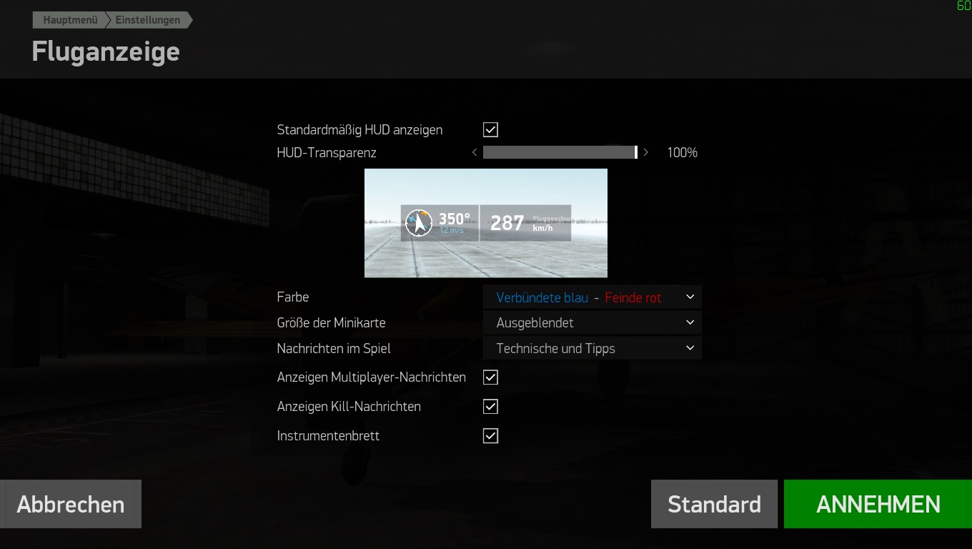 In diesen Dialog werden Einstellungen rund um die Anzeigen im Spiel konfiguriert. Die Bezeichnung HUD steht für Head-up-Display und stammt von der Glasscheibe die bei modernen Kampfjets in der Front des Cockpits eingebaut ist. Auf sie werden die verschiedensten Informationen wie z. B. Geschwindigkeit, Höhe, Kurs usw. projiziert.