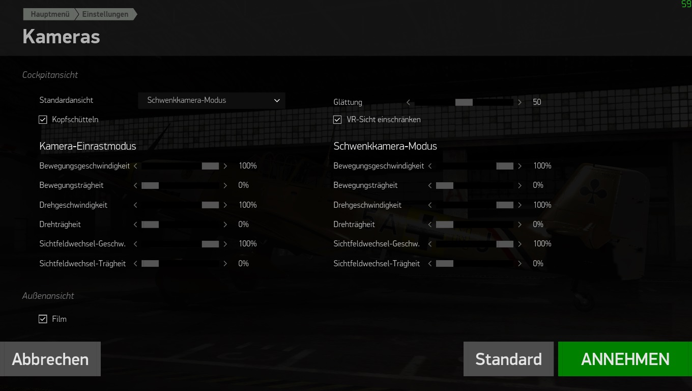 Wenn man kein Headtracking-System wie z. B. TrackIR verwendet, kann man auf dieser Seite einstellen, wie die Tasten zur Steuerung der Kopfbewegung reagieren. Da ich selbst TrackIR verwende, habe ich die Einstellungen, wie rechts im Screenshot zu sehen ist, festgelegt. Dadurch kann ich mit den Tasten "Kopf des Piloten: Zoomen" langsam rein- und raus zoomen, während die Tasten "Kopf des Piloten: hineinzoomen" und "Kopf des Piloten: herauszoomen" ganz schnell nach vorne und hinten springen. Mittels "Kopf des Piloten: Zoom zurücksetzen" werde ich in der Mittelstellung zentriert.