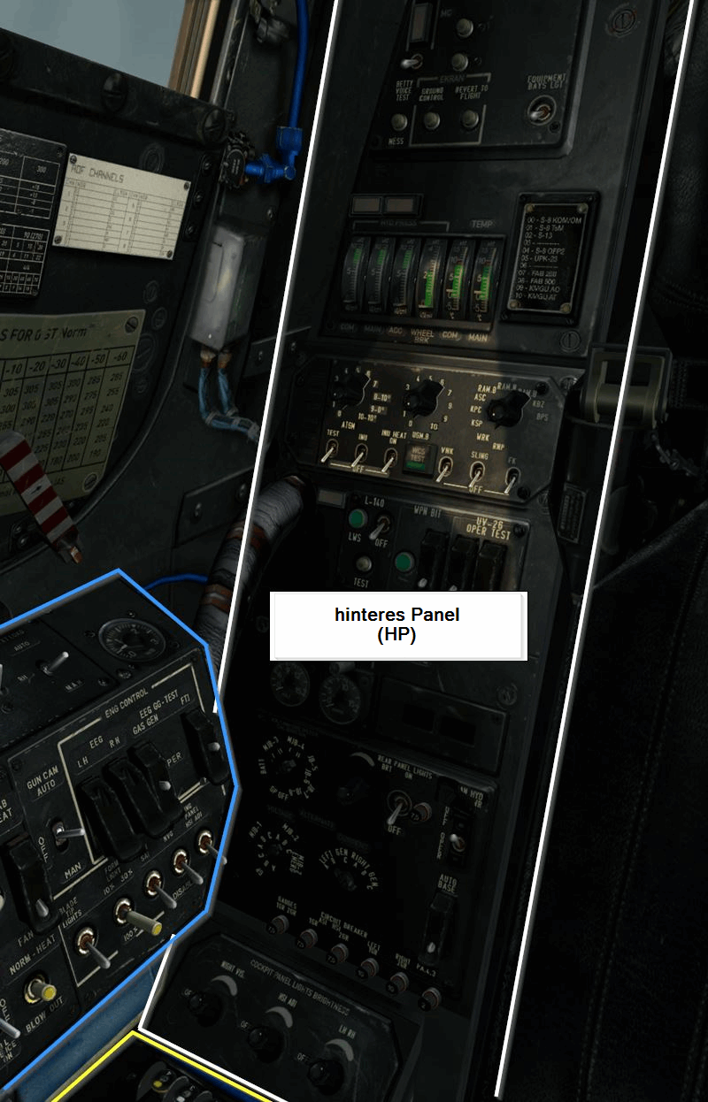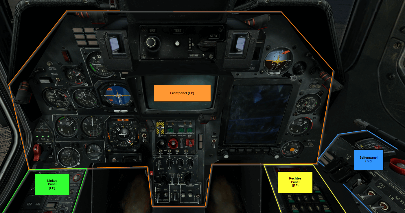 Das linke und rechte Panel teilt man auf in vorne / Mitte / hinten. Dabei ist vorne der Nase des Hubschraubers am nächsten und hinten bezeichnet das Ende der Konsole, das dem Heck am nächsten ist. Auch hier kann man z. B. in Checklisten eine Kurzform verwenden. So beschreibt man z. B. die Lage K-41 Schalters als linkes Panel, vorne oder kurz LP-V.