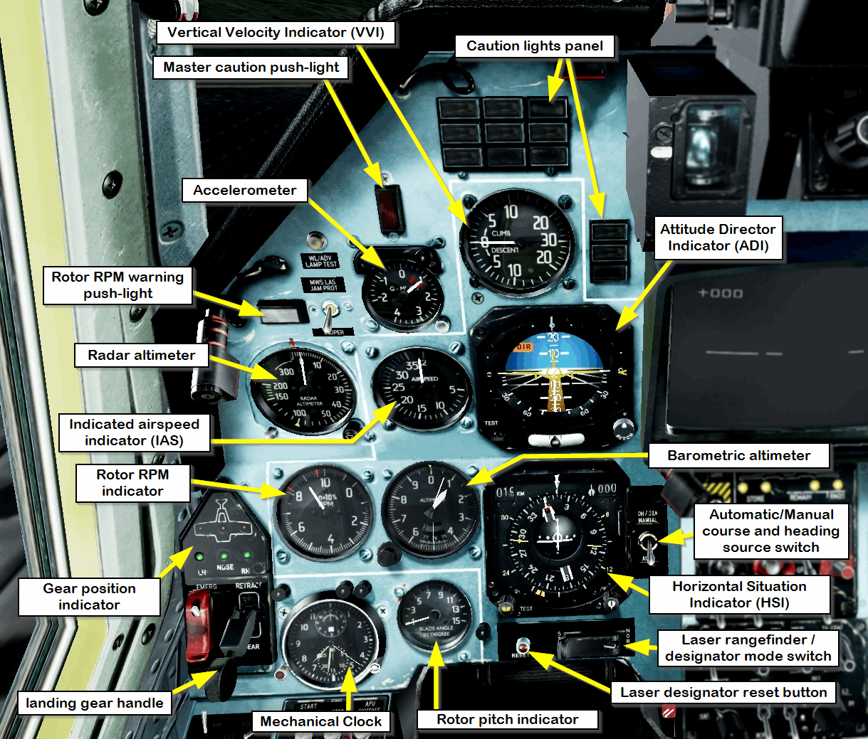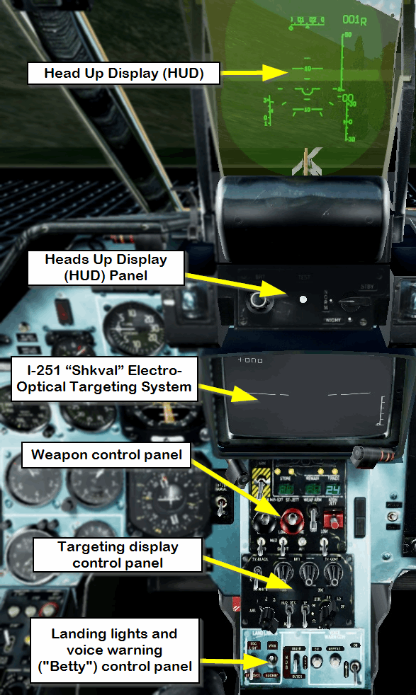 In the middle area there is the Head Up Display HUD, the electro-optical target system (Shkval), the weapons status and control panel (PUI-800), the control panel for target system displays and the control panel for landing lights and voice information system (Betty).