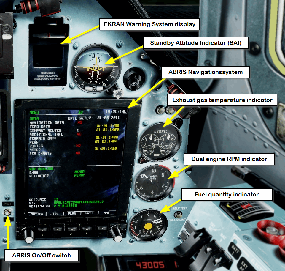 The two most important are the EKRAN warning and control system and the ABRIS navigation system. But also the exhaust gas temperature indicator, engine speed indicator and fuel quantity indicator are mounted there: