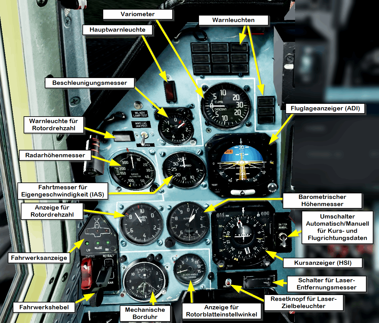 Als erstes schauen wir uns die Anzeigen auf der linken Seite des Frontpanels an. Diese Anzeigen solltest du ständig kontrollieren, da sie dir deine Höhe, Geschwindigkeit, Lage, Steig- bzw. Sinkrate, Kurs usw. anzeigen: