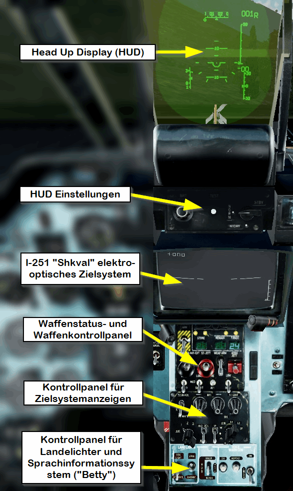 Im mittleren Bereich befindet sich das Head Up Display HUD, das elektro-optische Zielsystem (Shkval), das Waffenstatus- und Waffenkontrollpanel (PUI-800), das Kontrollpanel für Zielsystemanzeigen und das Kontrollpanel für Landelichter und Sprachinformationssystem (Betty).