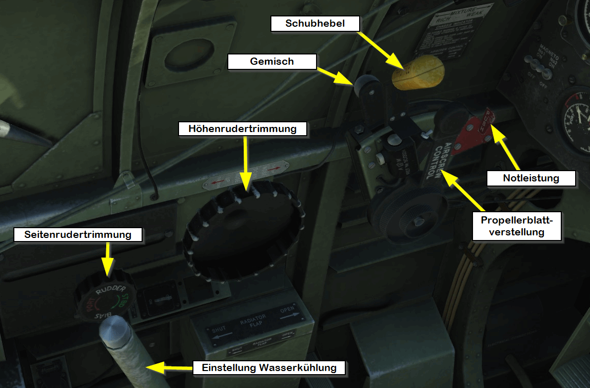 Die linke Konsole beinhaltet die Kontrollen für Schub, Trimmung, Gemisch, Kühlung und Propellerblattverstellung: