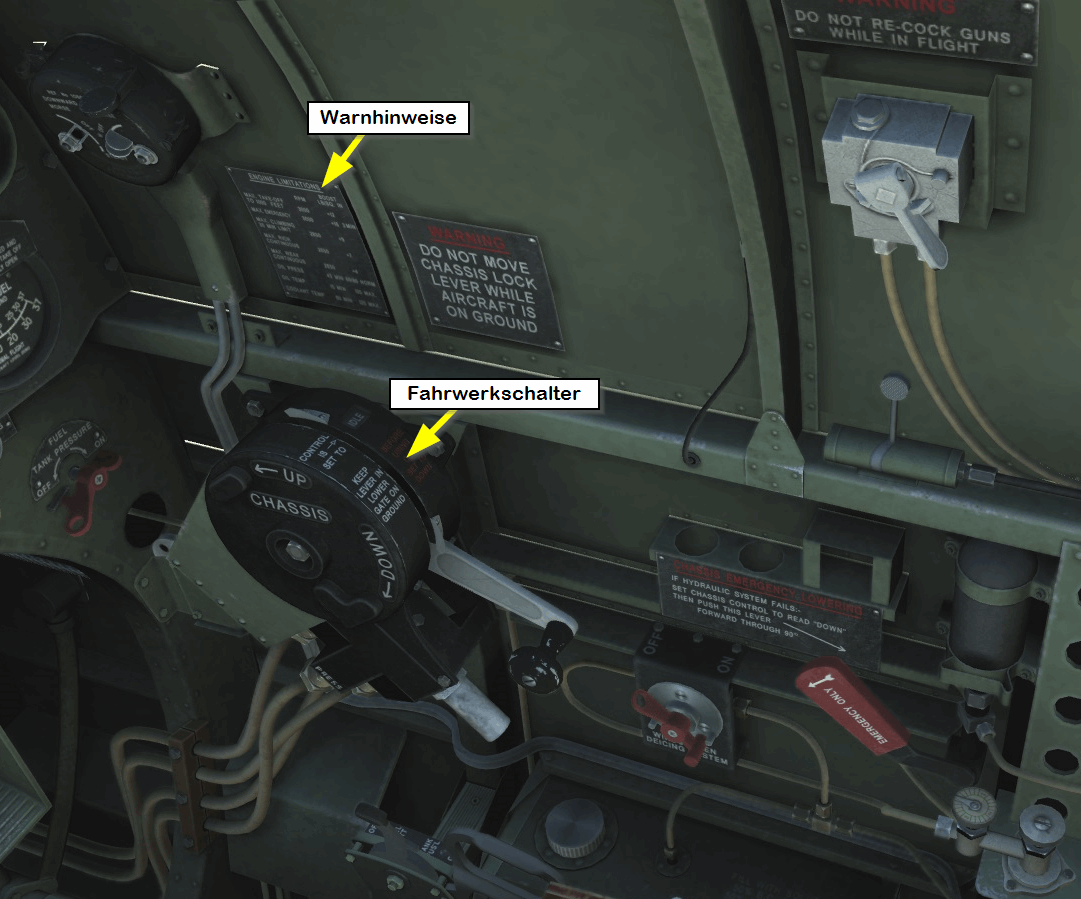 Bei der Spitfire befinden sich auf der rechten Konsole verschiedene Systeme, die aber bei IL-2 vom Spiel verwaltet werden. Daher ist die rechte Konsole fast schon uninteressant. Einzig der Fahrwerksschalter kann bedient werden.