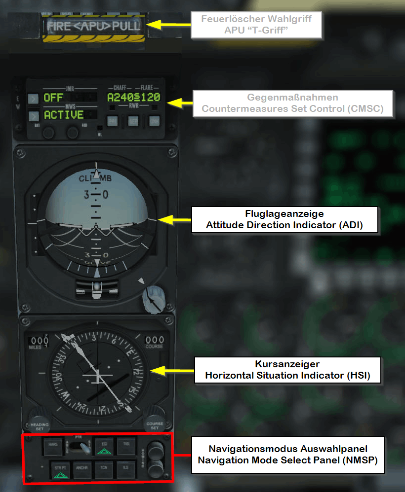 Im mittleren Bereich der vorderen Instrumententafel findest du vor allem Anzeigen für die Fluglage und den Kurs. Die wichtigsten Werte werden auch im Head Up Display angezeigt. Falls dieses ausfällt kannst die analogen Anzeigen verwenden. Das HSI bietet aber einige Zusatzfunktionen, die auch bei funktionierendem HUD zum Einsatz kommen.