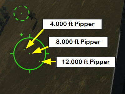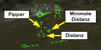 In der Mitte wird der, bzw. die Pipper angezeigt. Da die Flugbahn für hochexplosiven und panzerbrechenden Projektile unterschiedlich ist, werden bei Bewaffnung mit Combat-Mix zwei Einschlagpunkte angezeigt. Der obere ist für die HEI-Projektile und der untere für die Panzerbrechenden. Der Aufschlagpunkt wird kontinuierlich berechnet und angepaßt.