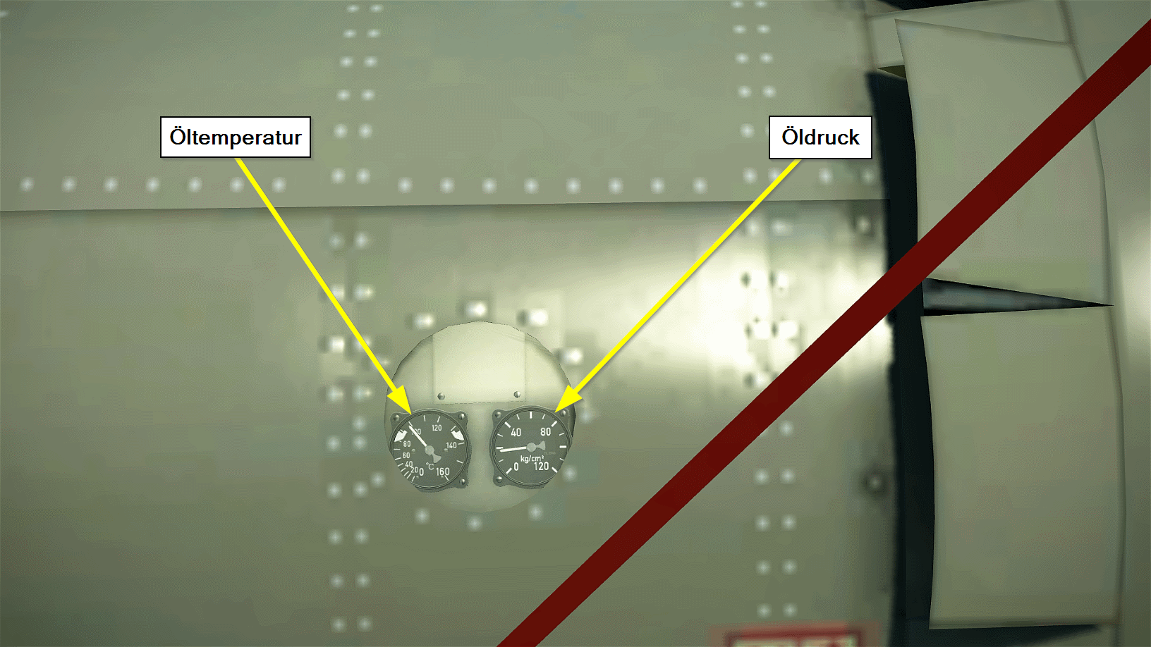 Ähnlich wie bei der Bf 110 befinden sich manche Anzeigen außerhalb des Cockpits auf den Motorgondeln, wie hier für Öltemperatur und Öldruck.