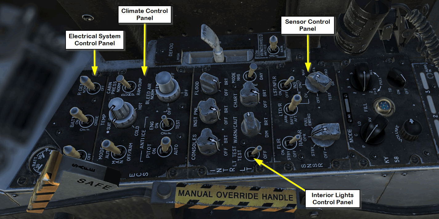 On the right console we are interested in the power supply control panel, environmental controls and lighting controls.