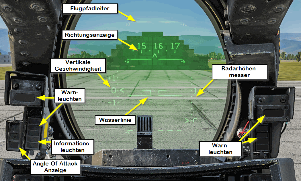 Das Head Up Display (HUD) beherrscht den oberen Bereich des Cockpits. Das HUD ist dabei die Frontscheibenprojektion der wichtigsten Flug- und Waffeneinsatzinformationen. Eingerahmt wird es dabei von einigen Anzeigen. Darunter die Anstellwinkelanzeige für den Landeanflug unten links, sowie einigen Warn- und Informationsleuchten. Die Anstellwinkelanzeige leuchtet nur bei ausgefahrenem Fahrwerk.