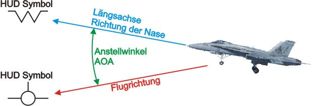 The Angle of Attack (AOA) is the angle between the flight direction and the longitudinal axis of the aircraft. This angle should be between 7.4° and 8.8° during landing. The angle of attack is directly related to the airspeed.
