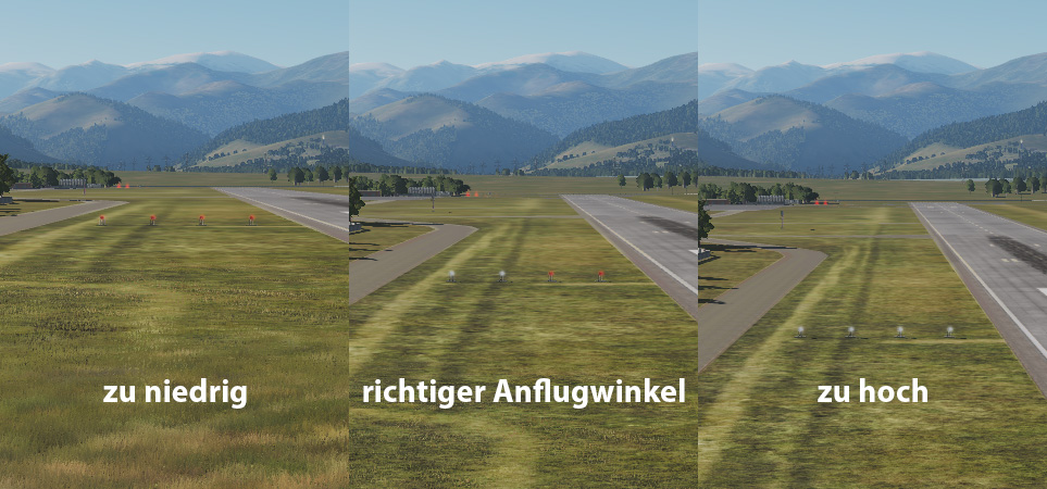 A little basic knowledge of the landing approach is necessary for you to complete a successful landing. Many airplanes are designed to approach the airport on a glidepath of 3°. Approximately 320 feet per nautical mile. So, it is possible to calculate which height you should have at which point on this 3° glide path. It is therefore possible to fly into the 3° glide path at any range at the approximately suitable altitude. During landing exercises you will quickly notice that there is a clear difference between how far you are from the airfield and how high you are. Therefore it is necessary to define a standard case. This is the 3° glidepath. That is why it is the first step for every landing to fly the aircraft as close as possible to this optimal case.