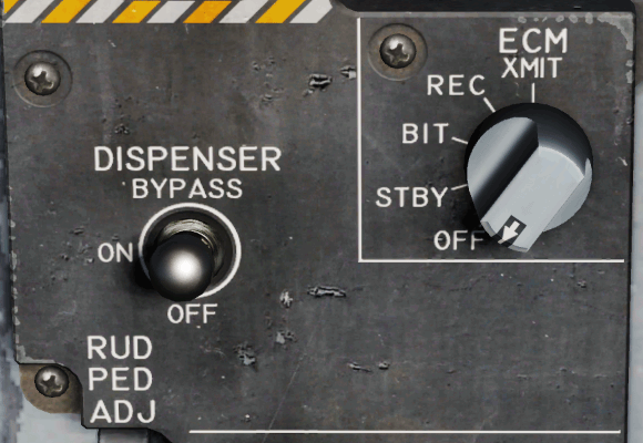 Bypass is the simplest mode. Once the MASTER ARM is activated and the DISPENSER is set to BYPASS, you can manually eject defenses using the eject switch on the thrust lever. When the switch is pushed forward, a charge of chaff is ejected, and when it is pulled backward, a flare is ejected.